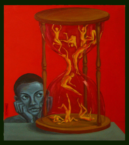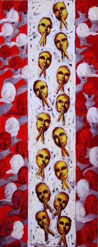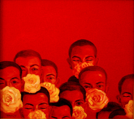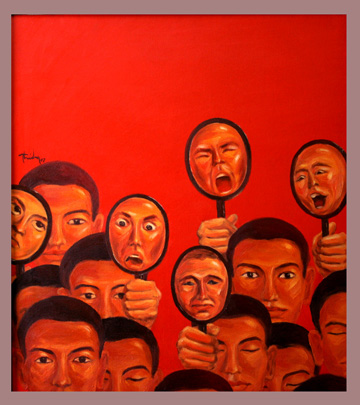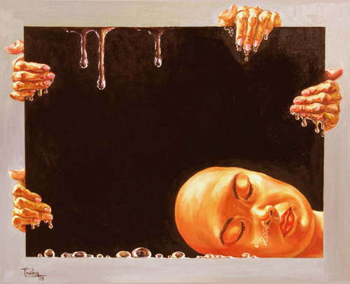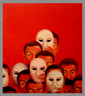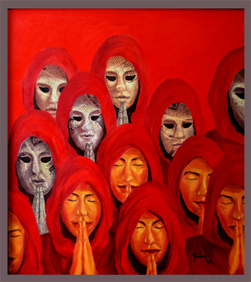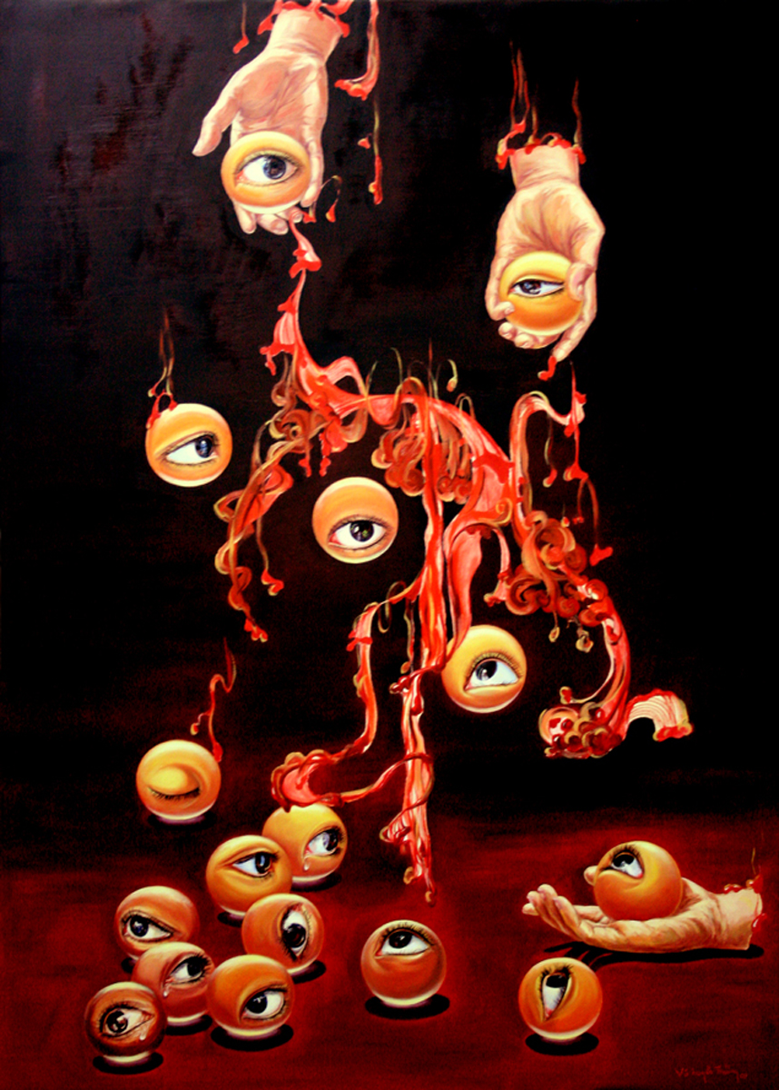 Vu Huyen Thuong often uses hot colors for more dramatic effects and to describe something oppressive inside each person, which prods their passion and desire to escape. The mysterious oriental elements in her paintings help her to convey her message better.